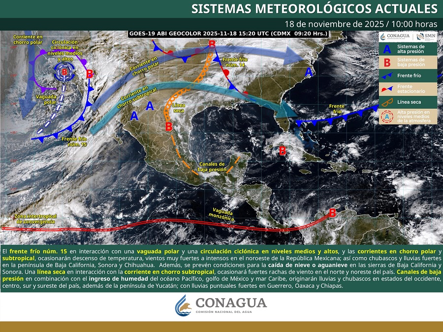 El Frente Frío Número 15 afectará hoy a gran parte del territorio nacional con un panorama meteorológico diverso que incluye lluvias puntuales fuertes, vientos intensos y marcado descenso de temperaturas. El sistema provocará condiciones climáticas significativas en estados del norte, centro y sureste del país.