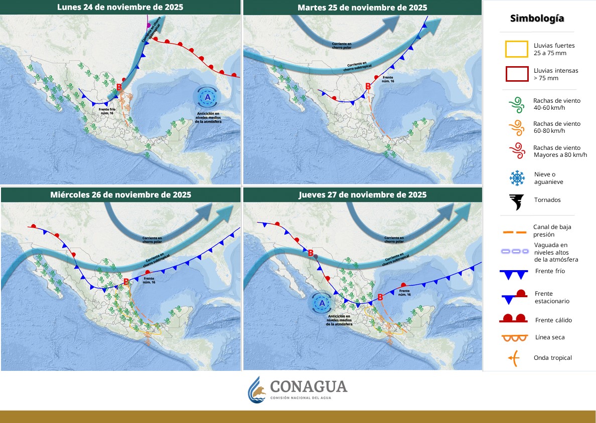 PRIMERA TORMENTA INVERNAL Y FRENTE FRÍO 16 PROVOCARÁN DESCENSO DE TEMPERATURA Y VIENTOS FUERTES EN MÉXICO