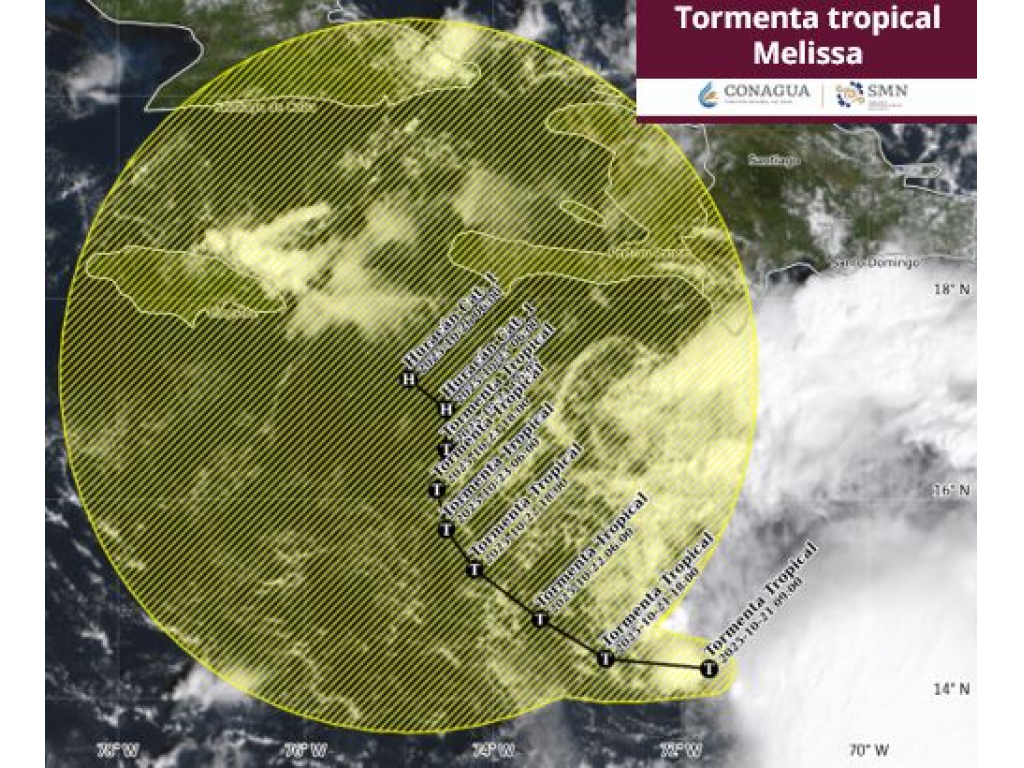 Melissa se localizó a 480 kilómetros al sur de Puerto Príncipe, Haití, y a aproximadamente 1,765 kilómetros al este-sureste de Punta Herrero, Quintana Roo. El fenómeno meteorológico presenta vientos máximos sostenidos de 85 kilómetros por hora con rachas de 100 km/h, y se desplaza hacia el oeste a 22 km/h con una presión mínima central de 1003 hectopascales.