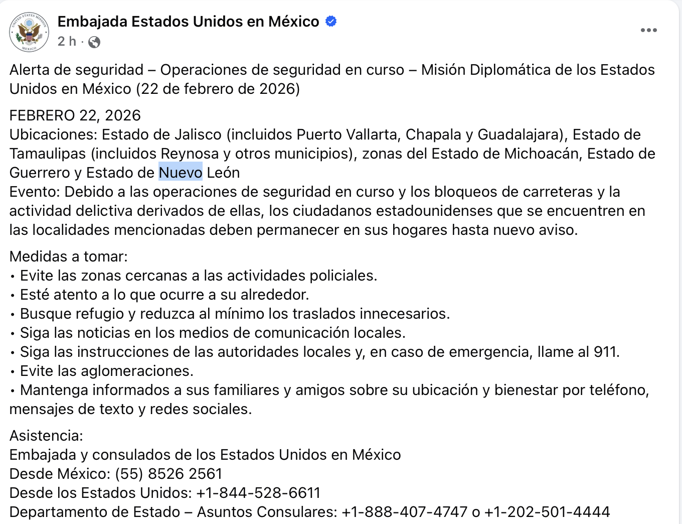 La embajada puso a disposición sus líneas de asistencia consular: desde México al (55) 8526 2561 y desde Estados Unidos al +1-844-528-6611. Esta alerta se da en el contexto de los operativos federales tras la muerte de Nemesio Oseguera Cervantes, alias “El Mencho”, líder del CJNG, en Jalisco, y las reacciones violentas registradas en diversos estados del país.