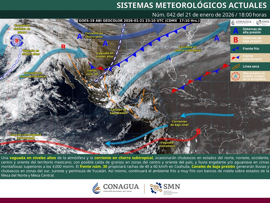 Un frente frío, una vaguada en niveles altos y la entrada de humedad generarán condiciones climáticas contrastantes este jueves en gran parte del país. En Zacatecas, se pronostican intervalos de chubascos de 5 a 25 milímetros, vientos con rachas de 30 a 50 km/h y heladas matutinas con temperaturas de -5 a 0 grados Celsius en zonas serranas.