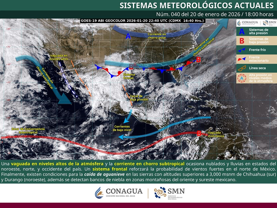 Las condiciones son resultado de una vaguada en niveles altos, la corriente en chorro subtropical y el ingreso de humedad del Pacífico, Golfo de México y Mar Caribe. Se exhorta a la población a atender los avisos del Servicio Meteorológico Nacional, abrigarse adecuadamente y evitar cambios bruscos de temperatura para prevenir afectaciones a la salud.
